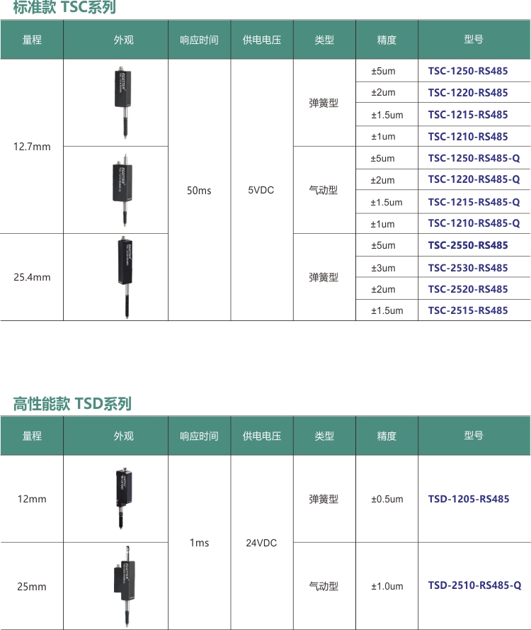 TSD系列有量程12mm和25mm可選,24V DC供電,彈簧款精度可達(dá)±0.5um,氣動(dòng)款精度可達(dá)±1um。