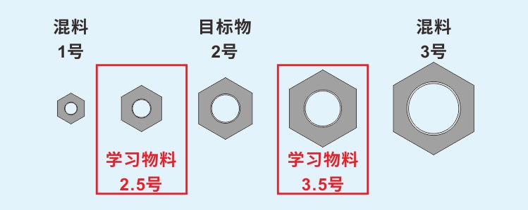 目標(biāo)物通過(guò)傳感器檢測(cè)區(qū)域時(shí)會(huì)以各種姿勢(shì)進(jìn)行,所以我們?yōu)榱吮苊饴z,經(jīng)常會(huì)選擇比原目標(biāo)物稍大和稍小的物料進(jìn)行學(xué)習(xí)。