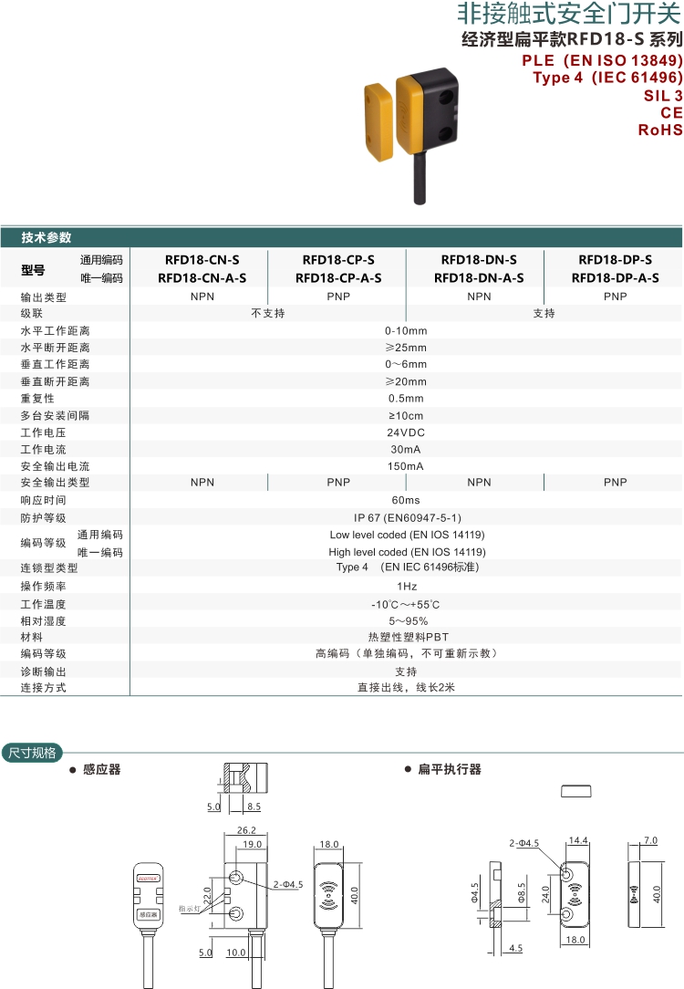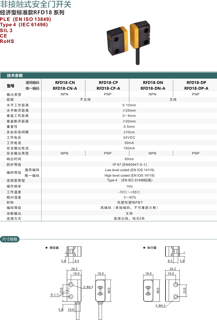 非接觸式安全門開關采用無線射頻識別應用技術(shù),無論周圍發(fā)生何種變化,都要安全地進行開關,非接觸式安全開關工作穩(wěn)定可靠??梢愿鶕?jù)風險評估和機器設計的要求使用。