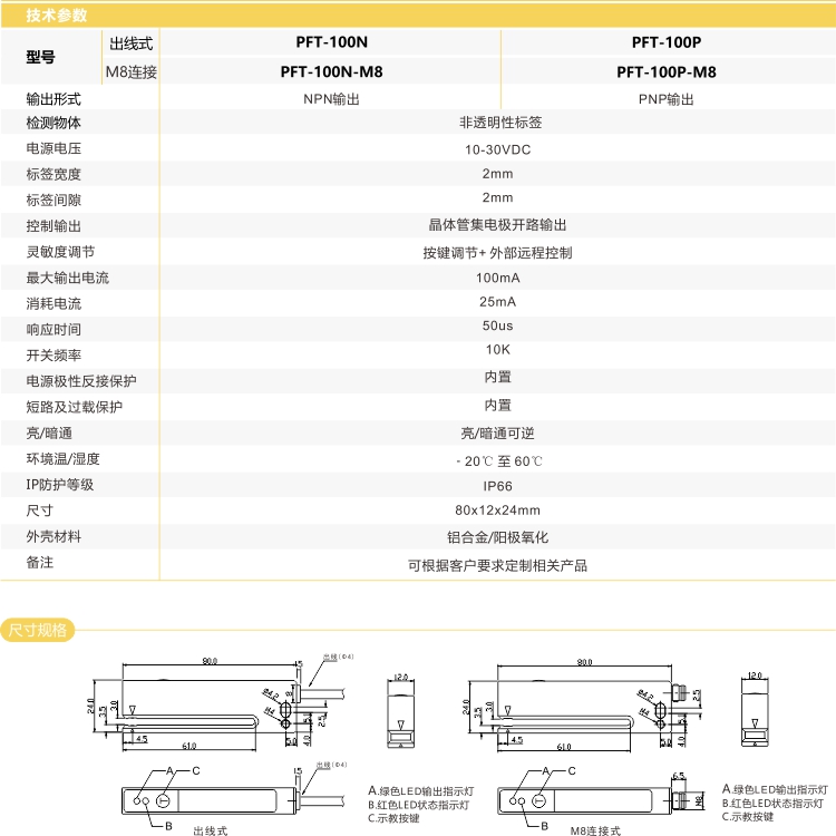ECOTTER 光電標(biāo)簽傳感器 PFT-100系列 可以高速檢測標(biāo)簽達(dá)10Khz,常開常閉可切換,常開是檢測到標(biāo)簽輸出信號(hào),檢測到間隙停止信號(hào);常閉是檢測到間隙輸出信號(hào),長按設(shè)置鍵8秒切換。